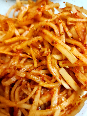 채 썬 무에 고춧가루를 넣고 잘 섞어주세요. 무가 고운 붉은색으로 물드는 모습을 상상하며 조심스럽게 버무려주세요.
