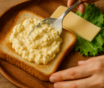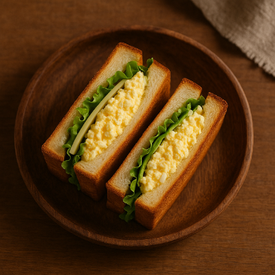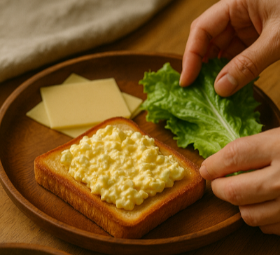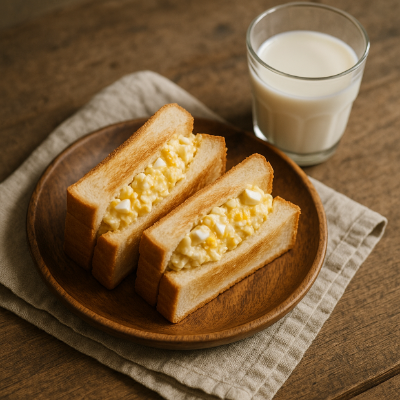 노릇하게 구운 식빵 사이로 부드러운 계란마요가 가득 채워진 한 입.