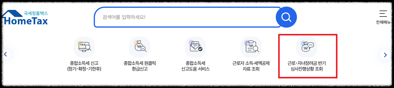 - [신청/제출] → [근로·자녀장려금] → [심사진행 상황조회] 클릭