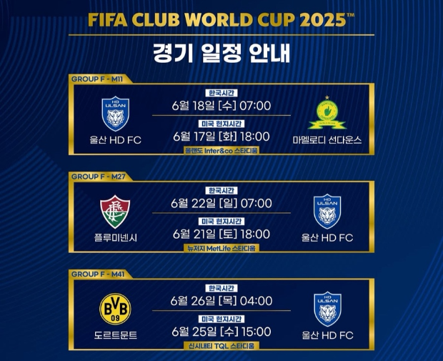 | 6월 26일 (목) | 도르트문트 vs 울산 HD | 오전 4시 |